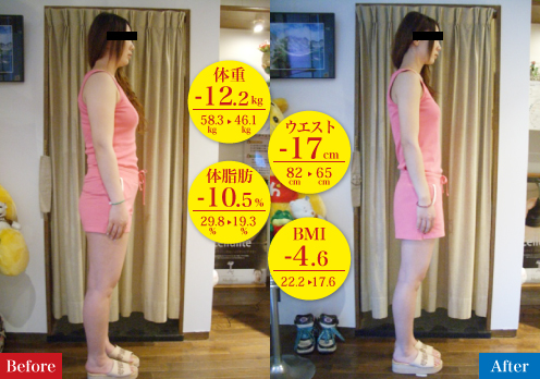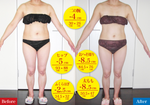ウエストもくびれ、身体のラインもキレイになり、気にしていた二の腕、背中、下半身もスッキリ!して、大・大・大満足です!!