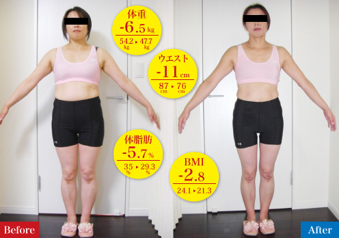 思っていたより辛くなく、2ヶ月で-6kg・お腹周り-12㎝と身体にメリハリが出てきました。この頃から“痩せたね!” “変わったね!”と、声をかけられる事が増えてきました。